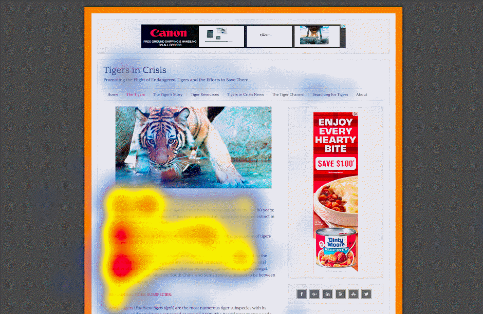 - التمركز: يعلمنا البحث في أنماط القراءة أن الأشخاص يقومون بقراءة محتوى الصفحة في شكل يشبه F. مثل ما هو ظاهر في الصورة التالية، هي من دراسة تتبعت عين القراء على صفحة ويب.